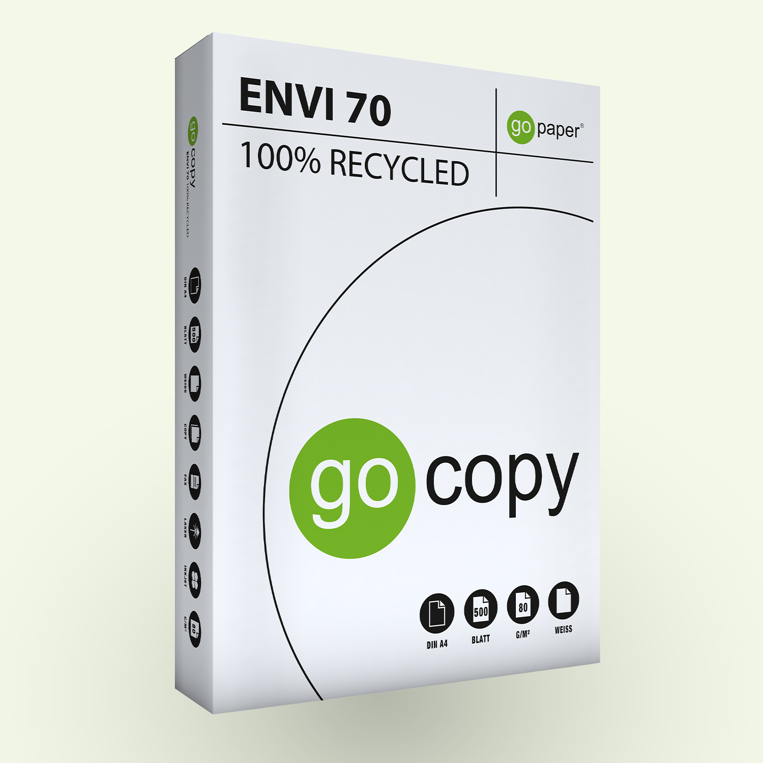 Carta multiuso 100% riciclata. Colore naturale. Un prodotto unico per l’ambiente, ideale per medie e grandi tirature. Ottima resa fronte/retro. È in risme da 80 grammi, formato A4. Certificata FSC® e Blauer Engel. Punto di bianco ISO 70.